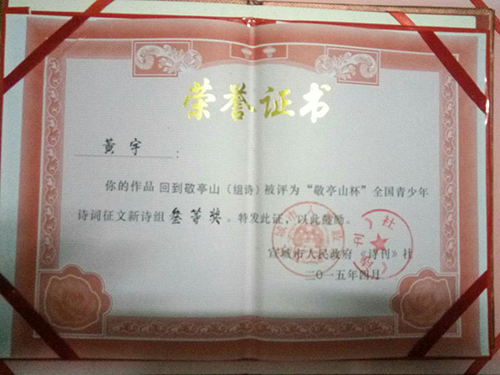 近日,青年作家黄宇同学再次收获多个文学大奖。其作品《书香母亲》荣获2015年第二届珠海市报春晖母亲节征文一等奖;作品《回到敬亭山(组诗)》荣获《诗刊》“敬亭山杯”全国青少年诗词征文新诗组三等奖;《茉莉花开》荣获第二届“新风度杯”全国文学竞赛三等奖。