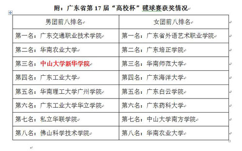 我院毽球队在林翠娟老师的带领下,共派出三名队员参加此次比赛。队员们先后战胜广东交通职业技术学院、广东财经大学华商学院、中山大学南方学院、广东水利电力职业技术学院、广东工业大学华立学院和广东工业大学代表队,获得本次比赛的季军。