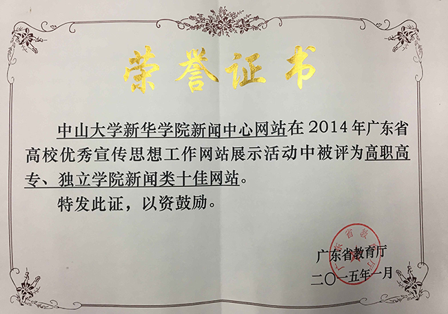 近日,省教育厅下发《广东省教育厅关于2014年广东省高校优秀宣传思想工作网站展示情况的通报》(粤教思函〔2015〕3号)文件,公布了2014年获奖的省高校优秀宣传思想工作网站。其中,我院宣传与新闻中心网站获评高校高专、独立学院新闻类十佳网站。