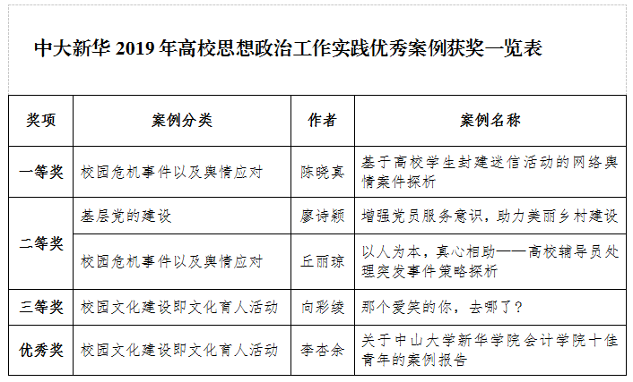 日前,高校思想政治工作队伍培训研修中心(华南师范大学)、教育部高校辅导员培训和研修基地(华南师范大学)、广东省高等学校思想政治教育研究会联合公布了“2019年高校思想政治工作实践优秀案例”评选结果,中山大学