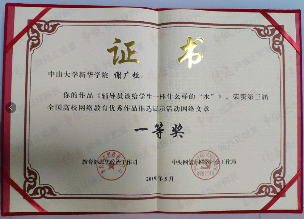 由教育部思想政治工作司、中央网信办网络社会工作局主办的第三届全国高校网络宣传思想教育优秀作品推选展示遴选结果已公布,我校法学院谢广桓老师撰写的网络文章《辅导员该给学生一杯什么样的“水”》荣获网络文章一等奖。