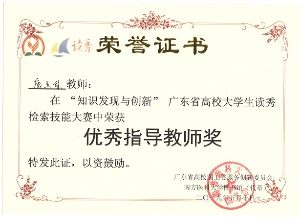 唐玉佳老师获“优秀指导教师奖”证书