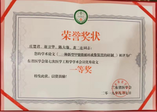 9月6日至8日,广东省医学会第七次医学工程学学术会议在广州翡翠希尔顿酒店召开。我校生物医学工程学院2015级毕业生庄楚君同学与广州市妇女儿童医疗中心的谢卫华科长及黄二亮老师等人合作完成的论文“一种新型甲襞微循环成像装置的研制”荣获年度会议优秀论文一等奖。