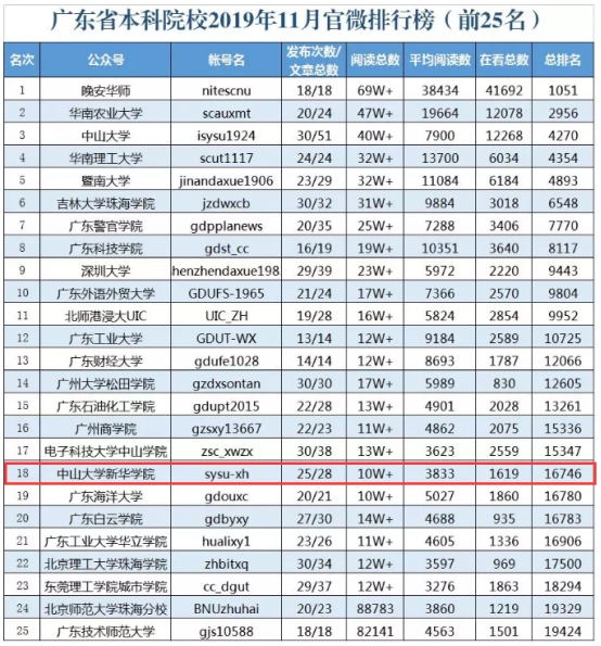 自主题教育启动以来,我校官方微信上持续发布大量的高站位、高质量、高传播度的新闻作品,传递了主旋律、正能量的声音,获得了很好的校园宣传效益。据12月23日,“广东教育”微信公众号公布的“广东省本科院校2019年11月官微排行榜(前25名)”榜单,中山大学
