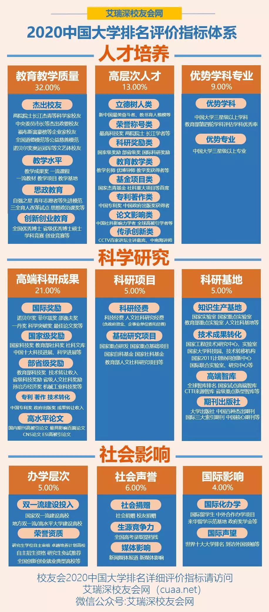 校友会2020中国大学评价体系采用教育教学质、高层次人才、优势学科专业、高端科研成果、科研项目、科研基地、办学层次、社会声誉和国际影响等9大核心指标,涵盖了400多项评测指标,基本涵盖国内外其他大学排名的高端质量指标,没有采用毕业生人数、毕业生就业率和SCI论文数等低端指标,是目前中国大学评价体系最为系统全面、评价指标与参评高校数量最多的大学排名。