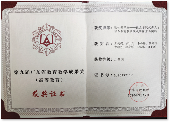 班——独立学院优秀人才教育教学模式探索与实践》项目获得了广东省高等教育教学成果奖二等奖。