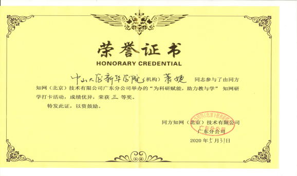 由广东知网主办的“4·23世界读书日——CNKI伴我行”读书月系列活动“为科研赋能,助力教与学”知网研学打卡活动于4月15日-5月15日正式开展。活动历时一个月,在活动开展期间,吸引了广东省30余家院校14000多名师生参与。其中,我校17级健康服务与管理萧婕读者荣获“为科研赋能,助力教与学”知网研学打卡活动三等奖。