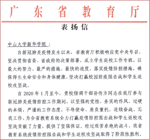 日前,广东省教育厅广东省疫情防控指挥办公室学生返校工作专班向我校发来一封表扬信,对我校体育系教师孙传方同志在借调至省厅期间的工作表现给予了充分肯定。