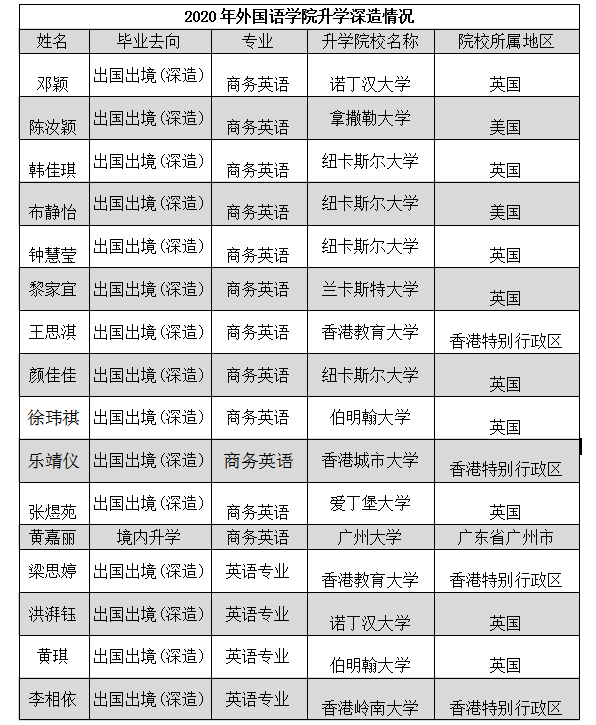 学院外国语学院(下文简称“外国语学院”)2020年被录取为硕士研究生的人数再创新高。2020届毕业生中共有36名同学被诺丁汉大学、拿撒勒大学、纽卡斯尔大学、香港教育大学、伯明翰大学、爱丁堡大学、广州大学、华东交通大学、广东技术师范大学等国内外知名学府录取,继续深造。