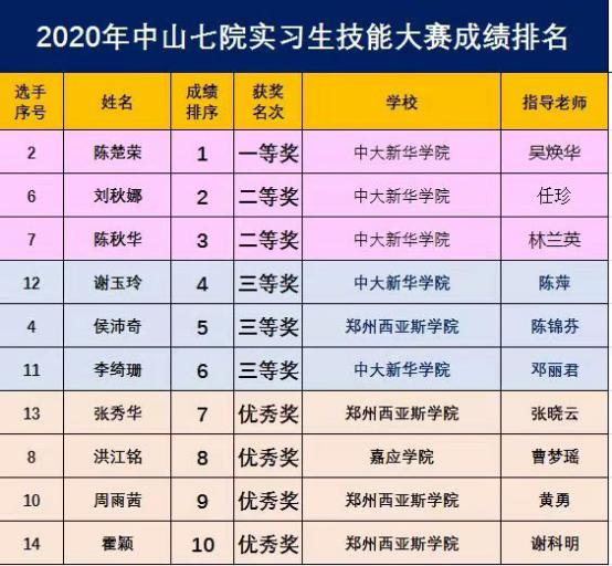 我校护理学子在2020年中山七院实习生技能大赛成绩排名中名列榜首