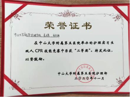 11月26日,在中山大学附属第五医院举办一年一度的“护理实习生双人CPR技能竞赛”中,我校护理实习生周丹妍与麦穗同学积极参赛,从13组竞赛队伍中脱颖而出,荣获二等奖。