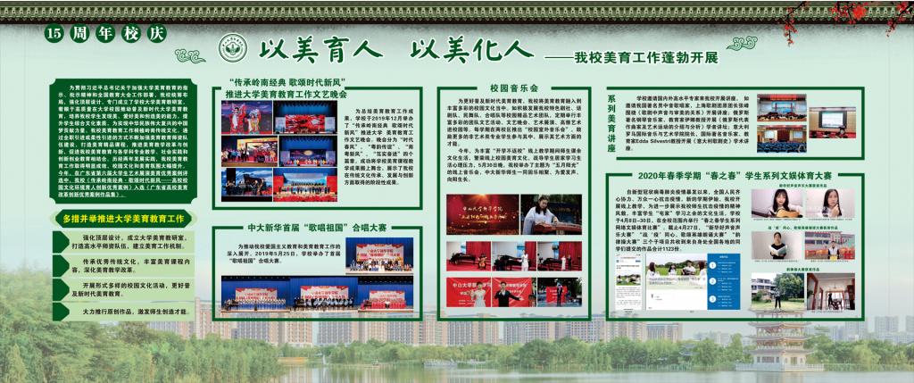 2019年12月我校成功举办“‘传承岭南经典 歌颂时代新风’推进大学美育教育工作文艺晚会”,晚会的成功举办,使我校在大学生美育教育工作中迈进了一个新的台阶,向更高的目标迈进。