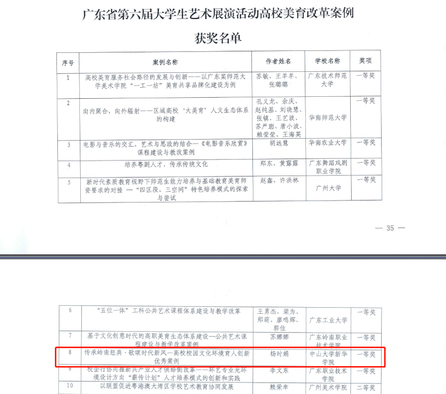 学院校园文化环境育人创新优秀案例”荣获广东高校美育改革创新优秀案例一等奖,并被省教育厅推荐参加全国第六届大学生艺术展演活动。