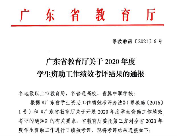 近日,广东省教育厅下发《广东省教育厅关于2020年度学生资助工作绩效考评结果的通报》(粤教助函〔2021〕6号),我校考评得分95.7分,在全省高校排名第10。