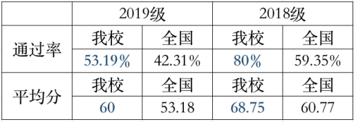 受到新冠肺炎疫情影响,18级考生延期一年与19级均参加2021年6月中旬考试。两个年级的考生成绩通过率、考试平均分均超出全国平均水平。18级学生通过率为80%,比全国通过率高出20.65个百分点;平均分68.75,高出全国平均分7.98分。其中,19级学生通过率为53.19%,比全国通过率高出10.88个百分点;平均分60,高出全国平均分6.82分。