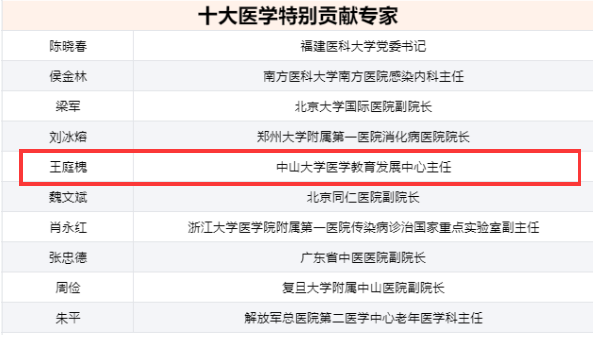 (以下简称“我校”)校长、中山大学中山医学院生理学教授、中山大学医学教育发展中心主任王庭槐荣获“十大医学特别贡献专家”称号。