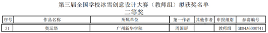 (以下简称“我校”)艺术设计与传媒学院副院长周国屏教授及其团队(万少锋、潘倩莹)创意设计作品“奥运塔”荣获大赛二等奖。
