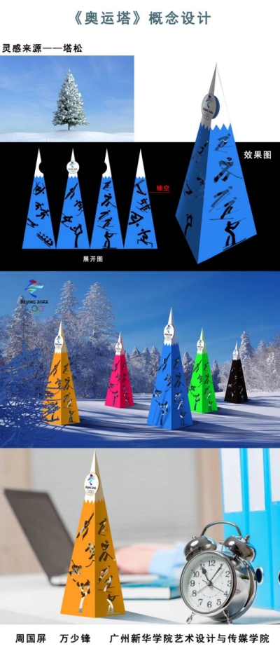 据了解,艺术设计与传媒学院在学校领导的部署下迅速组织教师和学生参与创作活动。周国屏认真研读大赛通知,领会“筑梦冰雪相约冬奥”的精神内涵与参赛要求,根据东北大自然的冬天冰雪环境,从雪山塔松造型获得灵感,将冬奥会的各种运动抽象造型巧妙地与塔松的抽象造型相结合,创作构思出“奥运塔”环境艺术装置。装置将冬奥会的会标置于顶端,突出主题,引领着塔身镂空的各项冬奥会运动项目。