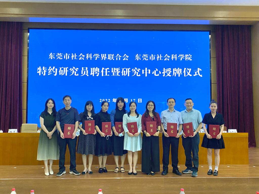 6月17日,东莞市社会科学界联合会、东莞市社会科学院特约研究员聘任暨研究中心授牌仪式在东莞市委党校举行。东莞市委常委、宣传部部长武一婷出席会议并讲话,为市社科院马克思主义研究中心、经济研究中心、社会研究中心、文化研究中心等四个研究中心授牌。东莞市委宣传部常务副部长赵国锋,东莞市社科联主席、市社科院院长张卫红为特约研究员代表颁发聘书。