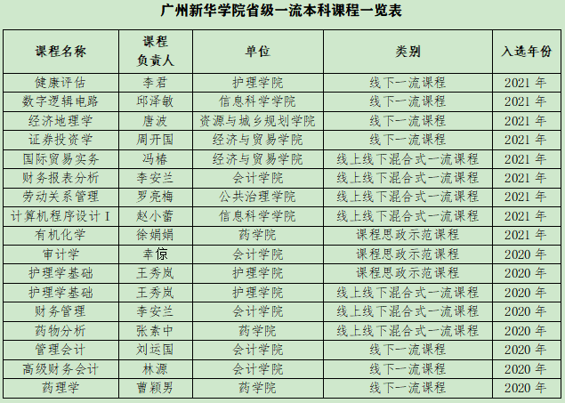 (以下简称“我校”)共有8门课程被认定为2021年度省一流本科课程。其中,《健康评估》《数字逻辑电路》《经济地理学》《证券投资学》4门课程入选线下一流课程,《国际贸易实务》《财务报表分析》《劳动关系管理》《计算机程序设计Ⅰ》4门课程入选线上线下混合式一流课程。