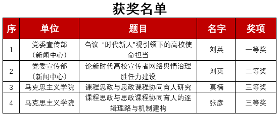 此次4篇论文获奖,充分体现了我校在党建研究方面取得的优秀成果。我校党委将通过加强指导、整合资源、制度保障等方式持续加大投入,鼓励广大党员踔厉奋发、笃行不怠,聚焦党建工作中的热点、难点问题结出丰硕成果,为学校党建工作高质量发展提供更强大的理论依据与智力支持。