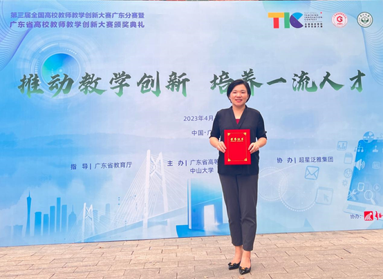 4月8日至4月9日,第三届全国高校教师教学创新大赛广东分赛暨广东省高校教师教学创新大赛举行,我校药学院徐娟娟教学团队(徐娟娟、成燕琴、王有娣、黎卓熹)荣获新医科赛道(副高组)三等奖;会计学院陈世忠教学团队(陈世忠、幸倞、丁佳佳、郭瑞营)荣获课程思政赛道(中级及以下组)优秀奖。