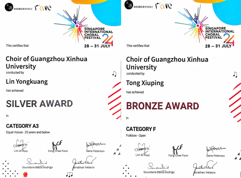 参赛队伍由音乐系直属党支部副书记童秀萍担任领队兼指挥,青年教师林永旷担任指挥,张徵静担任钢琴伴奏,音乐系20名学生组成参赛团队,从7月4日开始留校集训,做足准备,功夫不负有心人,合唱团师生一行在新加坡国立大学比赛时表现出色,荣获A3组(同声组)银奖、F组(民族组)铜奖!