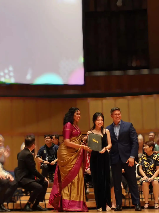 7月31日晚,在新加坡地标建筑——滨海艺术中心举办的颁奖典礼上,刘婉莉(霖霖)副校长上台领奖。