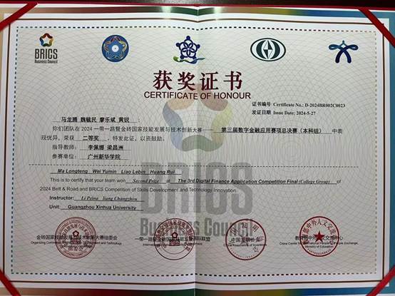 经济与贸易学院的四位学子收到由“2024一带一路暨金砖国家技能发展与技术创新大赛第三届数字金融应用赛项”大赛主办方颁发的获奖证书。