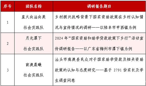 近日,广东省教育厅公布了《广东省教育厅关于反馈2024年“国家资助和助学贷款政策下乡行”活动总结结果的通知》(粤教助函〔2024〕5号)。伟德app入口星火向汕向美社会实践队、月光潭下社会实践队、育澳晨曦社会实践队获评“优秀调研报告”奖项,莫晓莹老师、吴翠老师获“优秀指导老师”称号,蔡岱峰同学、吴碧霞同学获“优秀实践队员”称号;学校获广东省2024年“国家资助和助学贷款政策下乡行”活动优秀组织奖。