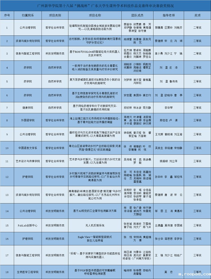 自2024年9月学校开展第十八届“挑战杯”广东大学生课外学术科技作品竞赛相关筹备工作以来,学校领导高度重视,多次召开专题研讨会部署“挑战杯”工作,院系精心培育和指导项目,今年学校共收到参赛申报项目117项;先后开展校赛复赛、决赛及省赛推优环节,后经评审评定及团省委发文有关推荐省赛项目的相关要求,最终推荐18个项目参加省级竞赛,其中15个项目拟授予省级三等奖,3个项目拟授予省级二等奖。省赛推荐项目均获奖,历史性突破学校“挑战杯”项目省赛获奖比例。