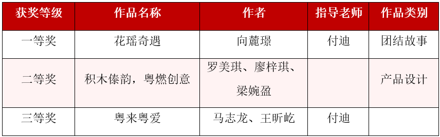 学生参赛作品《花瑶奇遇》荣获一等奖,《积木傣韵,粤燃创意》荣获二等奖,《粤来粤爱》荣获三等奖!