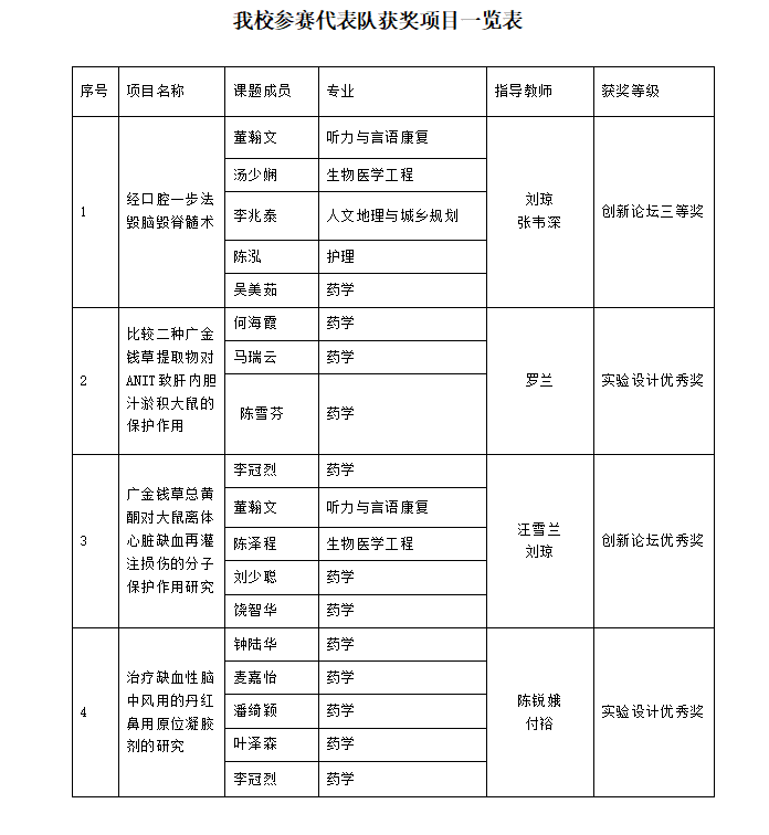 5月11-13日,由国家级实验教学示范中心联席会、教育部基础医学类专业教学指导委员会联合主办,中南大学承办的第五届中国大学生基础医学创新论坛暨实验设计大赛在长沙圆满结束。由刘琼、张韦深老师指导的董瀚文、汤少娴、李兆泰、陈泓、吴美茹等同学的创新论坛的项目《经口腔一步法毁脑毁脊髓术》荣获三等奖;由罗兰老师指导的何海霞、马瑞云、陈雪芬等同学的实验设计项目《比较二种广金钱草提取物对ANIT致肝内胆汁淤积大鼠的保护作用》,由汪雪兰、刘琼老师指导的李冠烈、董瀚文、陈泽程、刘少聪、饶智华等同学的创新论坛项目《广金钱草总黄酮对大鼠离体心脏缺血再灌注损伤的分子保护作用研究》,由陈锐娥、付裕老师指导的钟陆华、麦嘉怡、潘绮颖、叶泽森、李冠烈等同学的实验设计项目《治疗缺血性脑中风用的丹红鼻用原位凝胶剂的研究》获优秀奖。