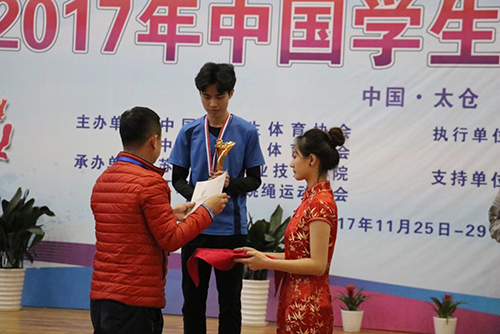 获得冠军的朱勇机同学正在接受颁奖
