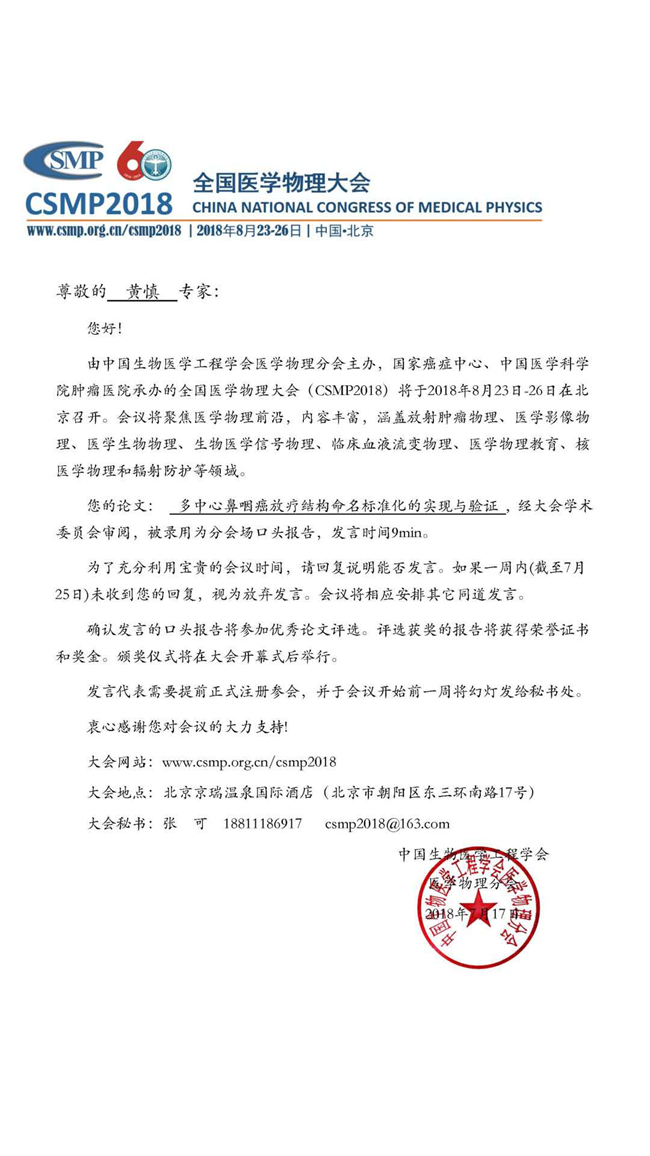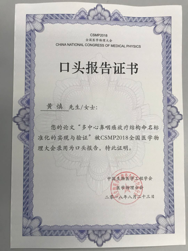 黄慎的论文被CSMP2018全国医学物理大会录用为口头报告证书
