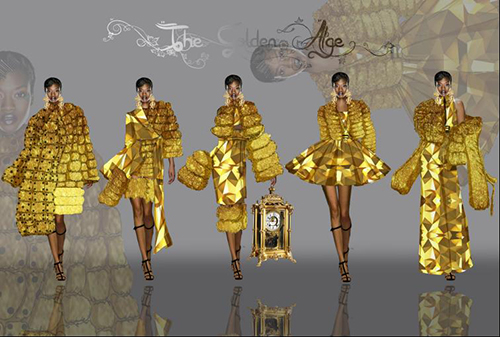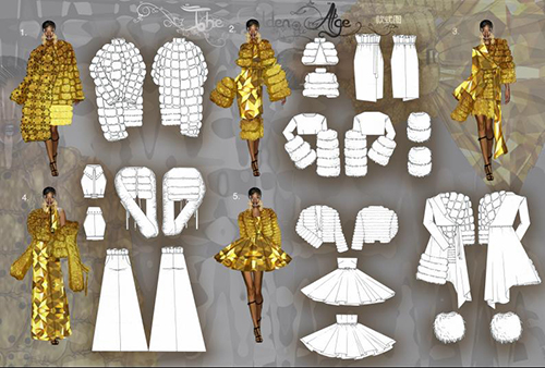 陈博洋同学说:“为了筹备比赛作品,我花了很多的心思和时间,也得到了郑培心老师的支持与指导。从最初的创建构思,寻找灵感源,直到受到比赛主题‘现代金属’的启发,才把作品创造出来,我的作品把复古金属和现代金属做了一次大胆地融合,图案和金属三角的切割源自美国赫斯特大厦的构造和外形,在颜色上选择了富丽的黄金色,款式上选择秋冬造型,将羽绒和毛绒面料进行重构组合,将复古的调色和当今的金属进行结合,创造一个现代的金属时代!”