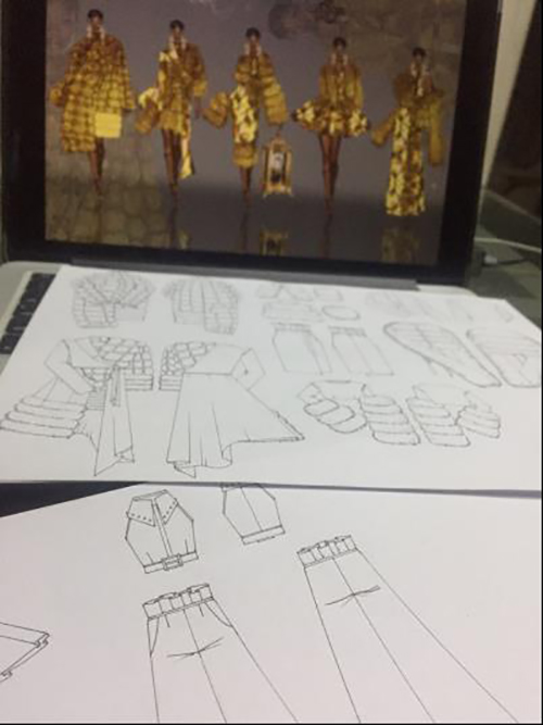 陈博洋同学表示,自己在款式的绘画上下了很大的功夫,从绘制的40套款式图中选择了5套辅佐整个系列,再用面料印花上的图案和灵感源结合,配色、配饰上的选择也与主题紧紧相扣。虽然准备作品的时间很紧迫也很辛苦,经常都要熬到凌晨3、4点,但相比辛苦,享受整个过程中的成长是更值得去珍惜和拥有的!我由衷地感谢每一位教过我的中大