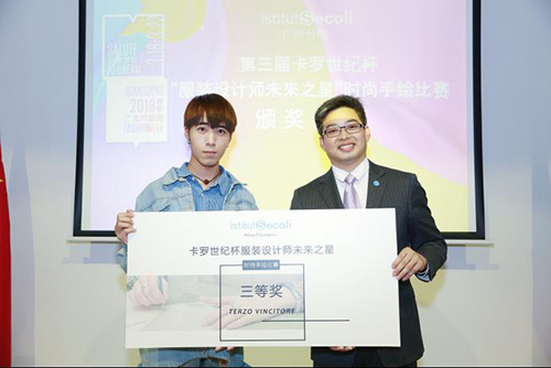 意大利卡罗世纪服装学院广州分院院长李昌松先生(右)为陈博洋同学(左)颁奖