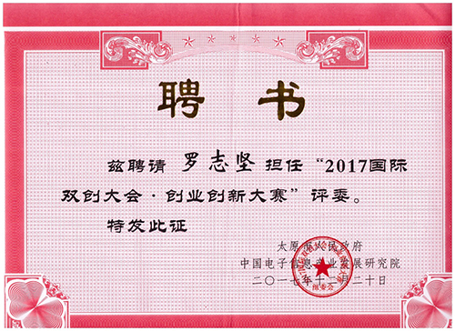 罗志坚老师荣获2017国际双创大会创业创新大赛评委聘书