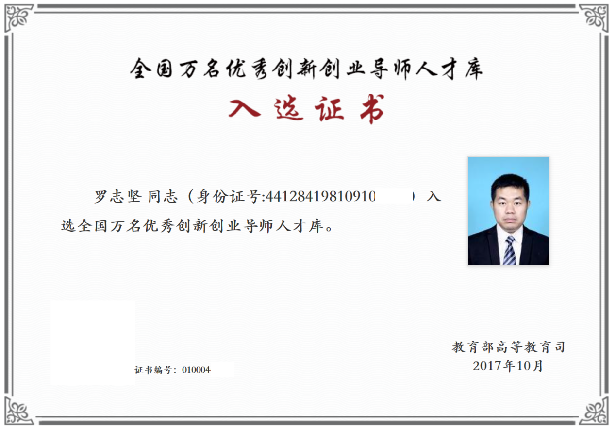 罗志坚老师入选教育部全国万名优秀创新创业导师证书
