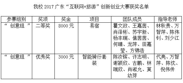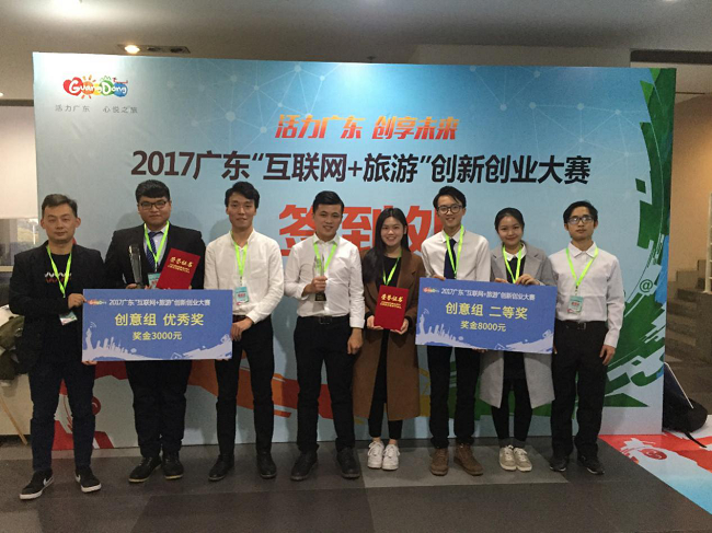 2017年广东“互联网+旅游”创新创业大赛在2017年12月26日落下帷幕。我校信息科学学院两支参赛团队在众多学校中脱颖而出,由瞿文政、王嘉茵等同学组成的团队获得创意组全省第三名(二等奖),陈汝镔、许志明等同学的团队获得创意组全省第八名(优秀奖)。其中,瞿文政团队和清华大学并列二等奖,真实上演了一次“当清华遇上