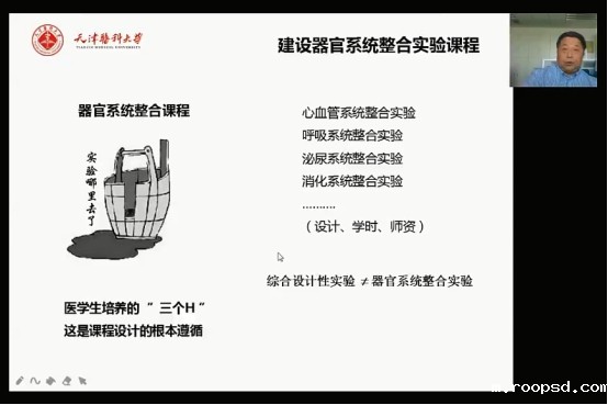 在讲座的后半场,康毅结合目前疫情的特殊情况,谈了几点对医学实验改革的思考:第一,通过对动物理论、科学精神、爱国主义、学校校史方面相结合教育,将思政教育融入实验教学;第二,正确理解3R——Reduction(减少)、Replacement(替代)、Refinement(优化),提高实验教学品质和动物质量;第三,综合利用实验动物,提高动物的品质和质量,提高实验教学效比;第四,依靠医学生培养的“三个H”——灵巧的手,机敏的头,仁慈的心,建设器官系统整合实验课程;第五,介绍机能实验新形态——以高质量动物实验为主,虚拟仿真实验其次,另外应该有人体生理实验,吸引学生以机能实验学为依托开展创新论坛暨实验设计大赛的项目。