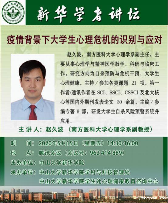 讲座伊始,赵久波介绍了新冠肺炎疫情的特点,并结合专业调查数据呈现了疫情对大学生的心理影响,如过度关注网络消息造成的过度焦虑,居家相处带来的家庭关系变化及困境等。