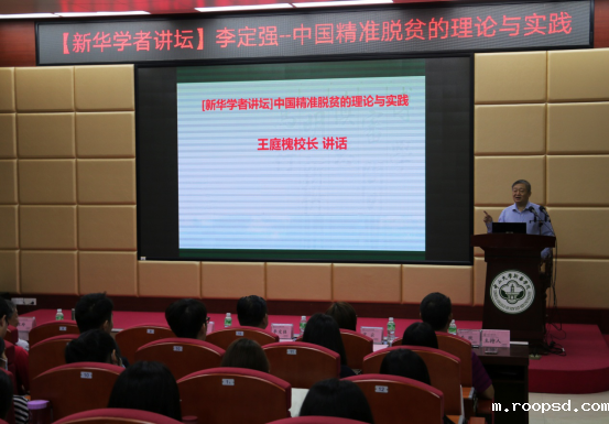 王庭槐校长代表学校对李定强副院长的到来表示欢迎。他讲到,中国共产党自成立之日起就以全心全意为人民服务为根本宗旨,贫穷不是社会主义,精准脱贫是中国共产党执政兴国的必然举措。党的十九大报告中指出“从现在到2020年,是全面建成小康社会决胜期”,精准脱贫是全面建成小康社会的刚性任务。我们的广大师生要积极投身这一伟大事业之中,为决胜全面建成小康社会作出应有的更大的贡献。