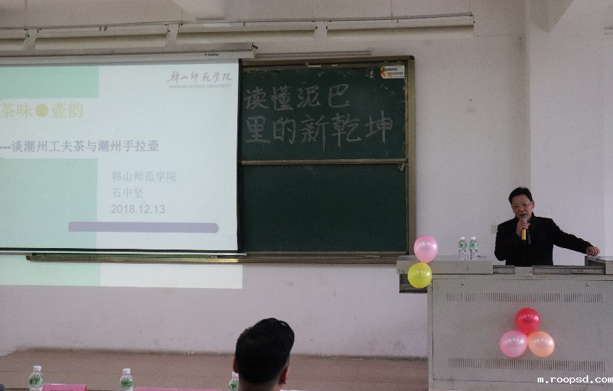 石中坚教授以小故事幽默开讲,为在场师生讲述了茶文化对潮州人的影响。茶文化与潮州人联系密切,喝茶早已变成潮州人生命里的一部分。他分别从生存策略、经济功能、礼敬传统、敦睦乡情四个方面做了详细的介绍。
