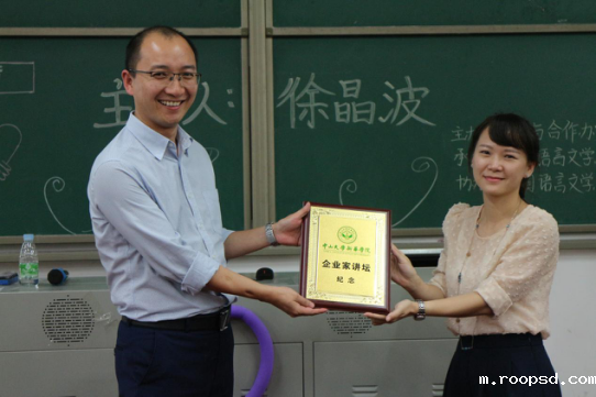 讲座的最后,外语系办公室副主任欧衍伽代表外语系师生向徐晶波副总经理颁发了企业家讲坛纪念证书,感谢徐总为bv伟德体育app官网师生带来了一场如此内容丰富的讲座。