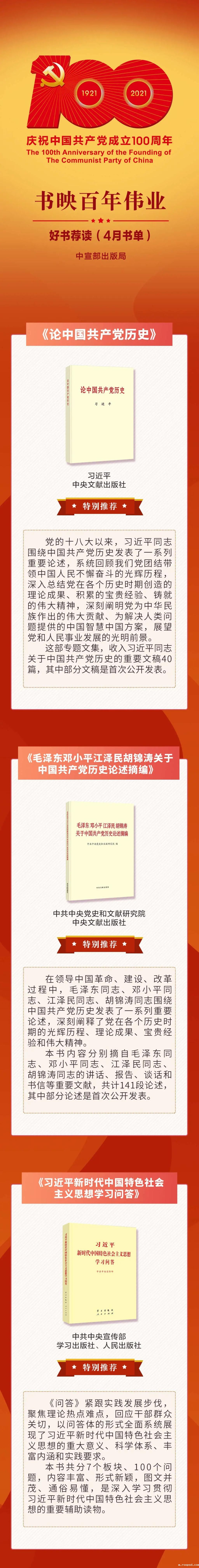 为庆祝中国共产党成立100周年,中共中央宣传部出版局联合有关单位和部门开展“书映百年伟业——庆祝中国共产党成立100周年好书荐读”活动,于2021年4月—12月,每月向全社会公布当月推荐书单。4月书单,一起来看