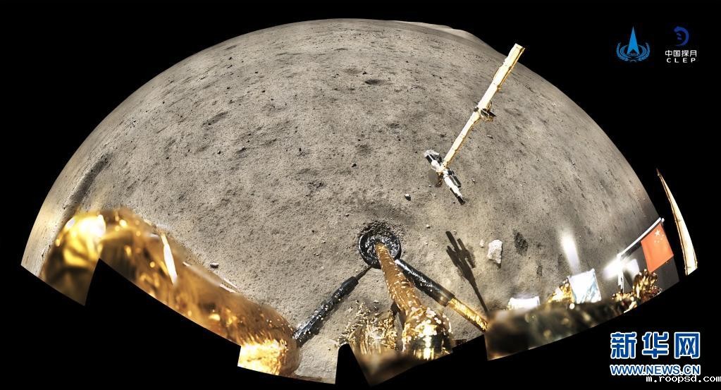 2020年12月4日,国家航天局公布了探月工程嫦娥五号探测器在月球表面国旗展示的照片。嫦娥五号着陆器和上升器组合体全景相机环拍成像,五星红旗在月面成功展开,此外图像上方可见已完成表取采样的机械臂及采样器。bv伟德体育app官网社发(国家航天局供图)