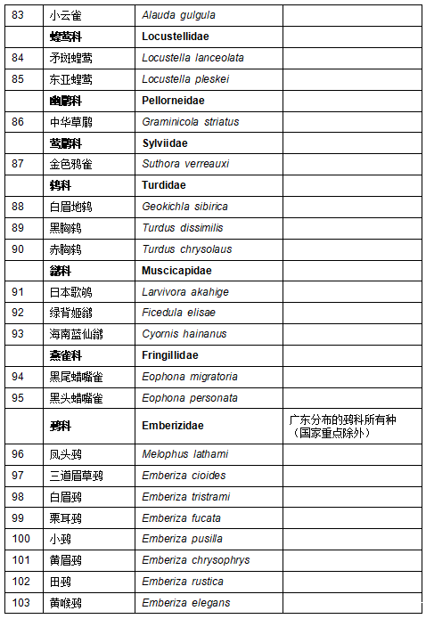 日前,经省人民政府同意,广东省林业局正式印发《广东省重点保护陆生野生动物名录》。新版《名录》由原先的81个物种增加到现在146个物种。其中哺乳类10种,鸟类107种,爬行类14种,两栖类12种,昆虫类3种。特别是增加了蝙蝠类和昆虫类,弥补了以往名录的不足。