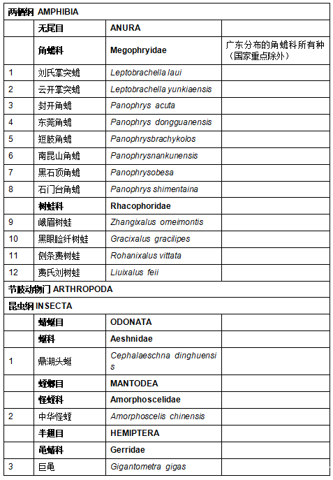 对广东省特有的两栖爬行类,如黑石顶角蟾、封开角蟾、东莞角蟾、广东颈槽蛇、深圳后棱蛇等,考虑到这些种类为近年新发现的物种,且分布区域狭窄,种群数量及濒危程度未作评估,故将其列入保护范围。